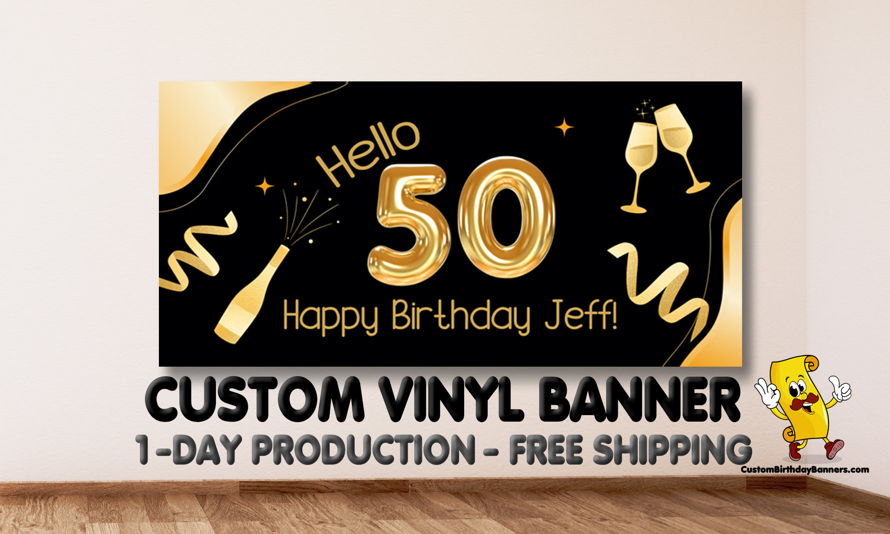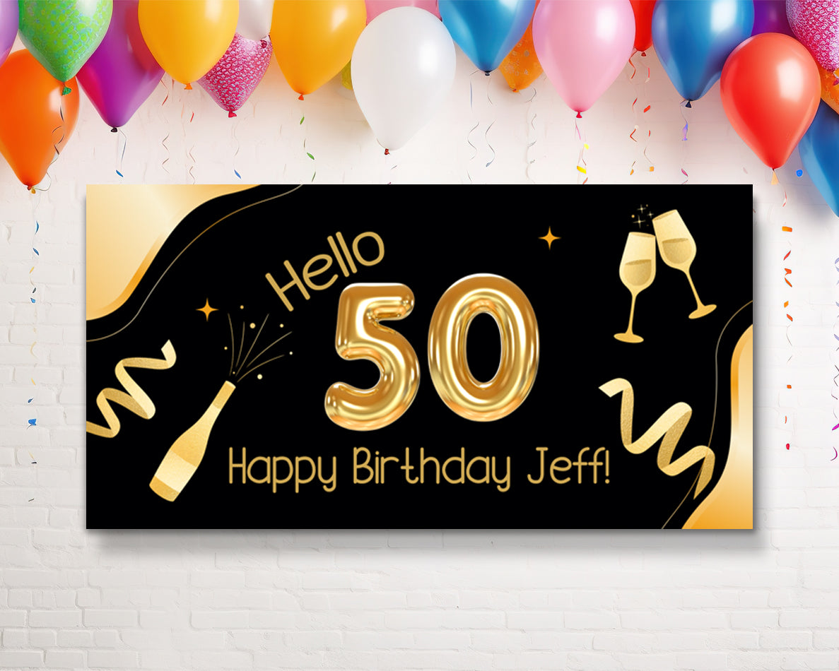 Celebrate with this personalized 50th birthday banner backdrop! Banner can be written on for lasting birthday memories and is sure to be the centerpiece of your birthday celebration.