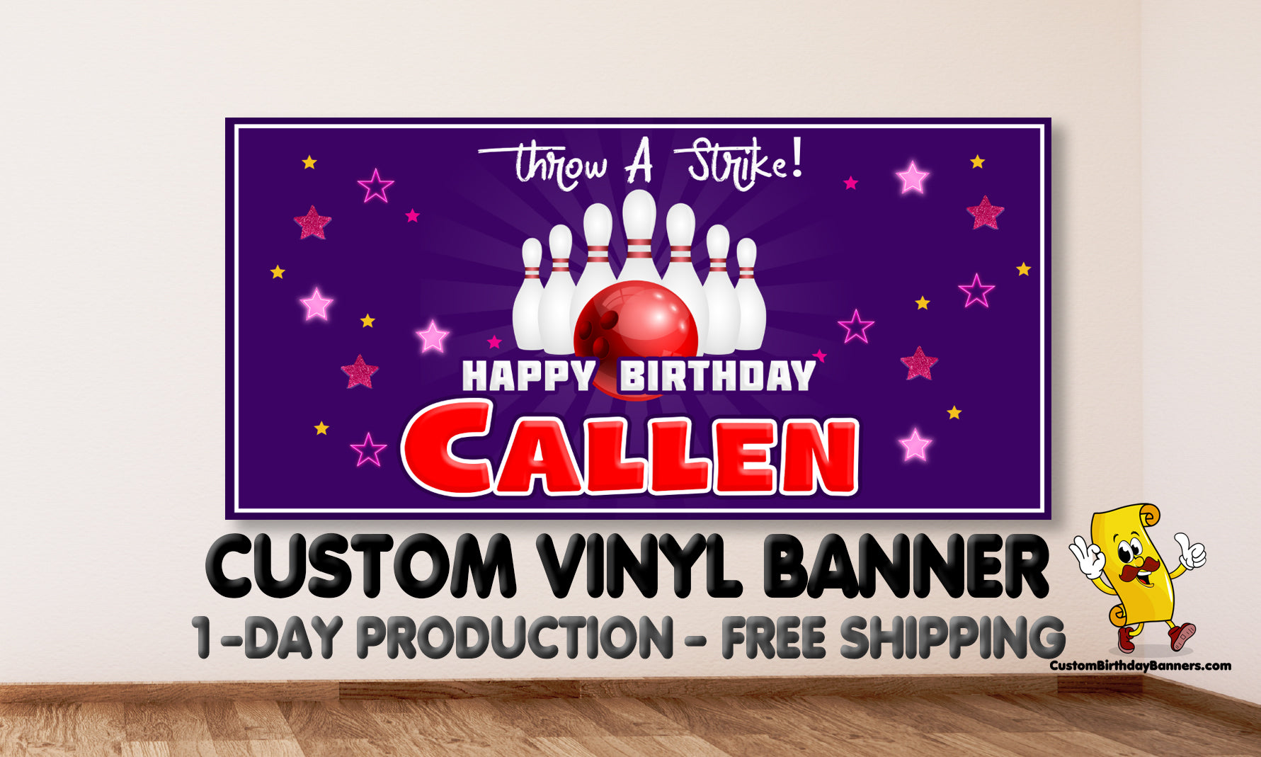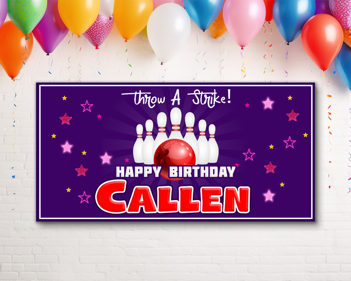 Throw A Strike! Its a Bowling Birthday Party! Celebrate your Kingpin with this vibrant full color Bowling Party personalized birthday banner backdrop! Offered in a variety of sizes, this banner will surely be the centerpiece of your bowling Birthday celebration!