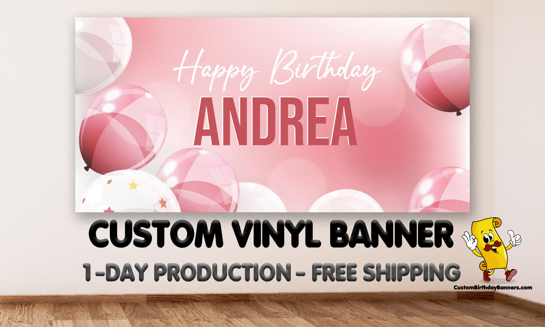 Celebrate with this personalized pink balloon birthday banner backdrop! Banner can be written on for lasting birthday memories and is sure to be the centerpiece of your birthday celebration.