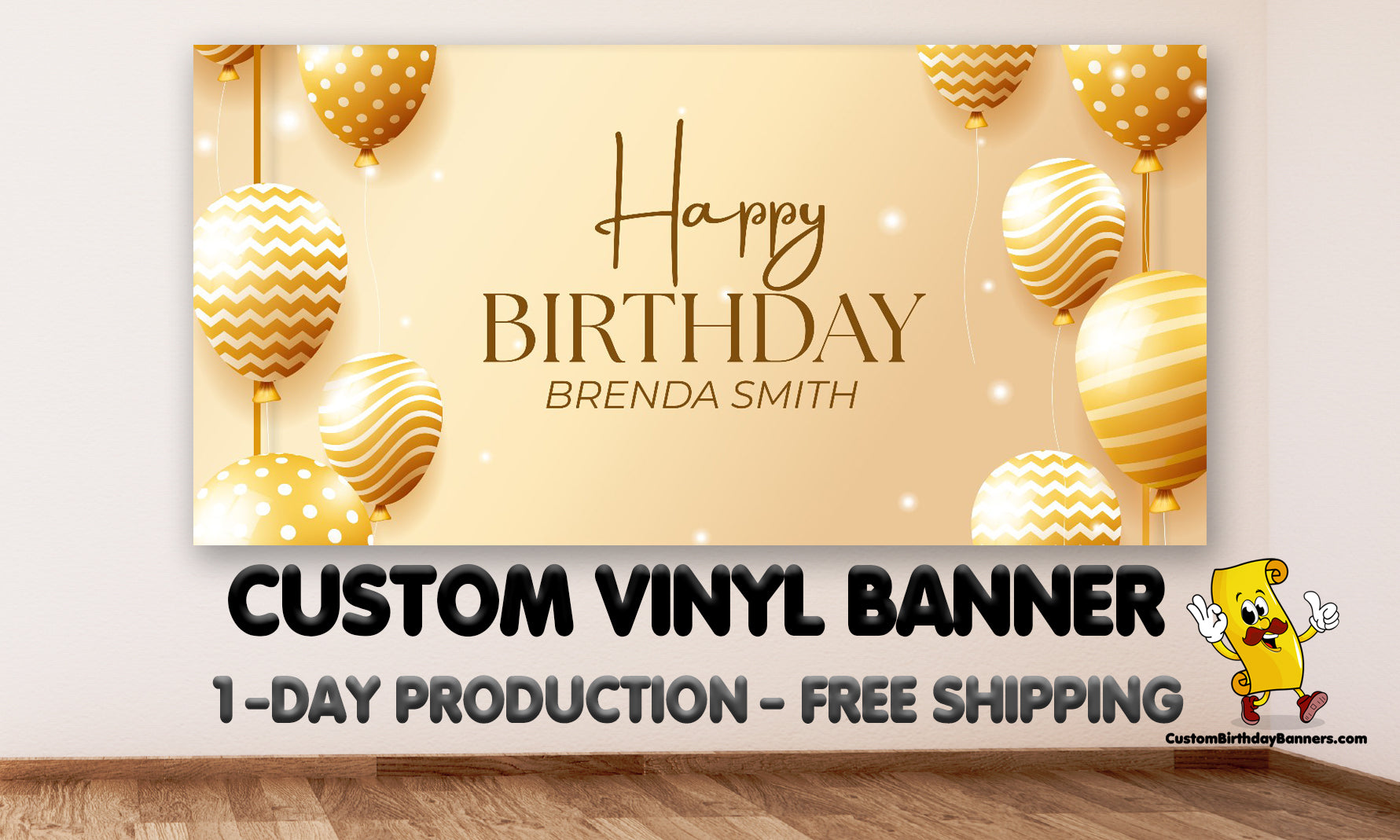 Celebrate with this personalized Gold Balloons birthday banner backdrop! Banner can be written on for lasting birthday memories and is sure to be the centerpiece of your birthday celebration.