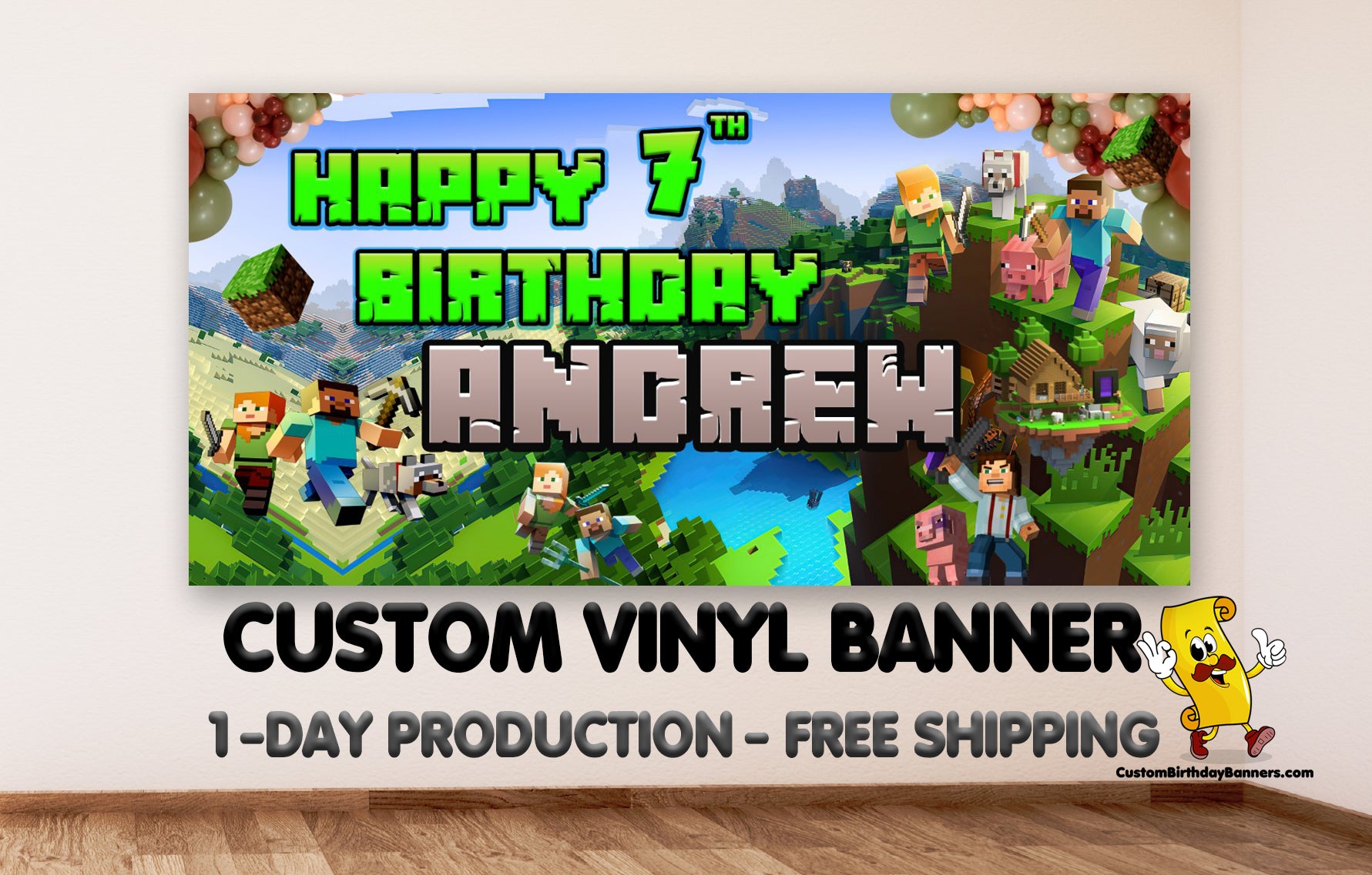 Celebrate your young one with this vibrant full color Minecraft game personalized birthday banner backdrop! Offered in a variety of sizes, this banner will surely be the centerpiece of your celebration!