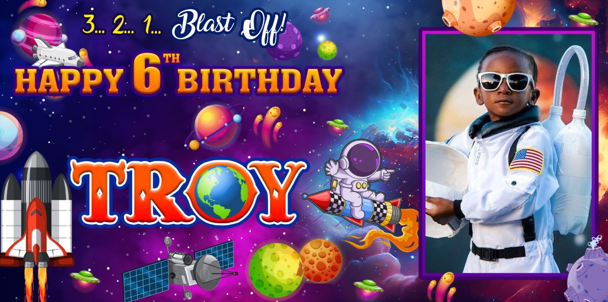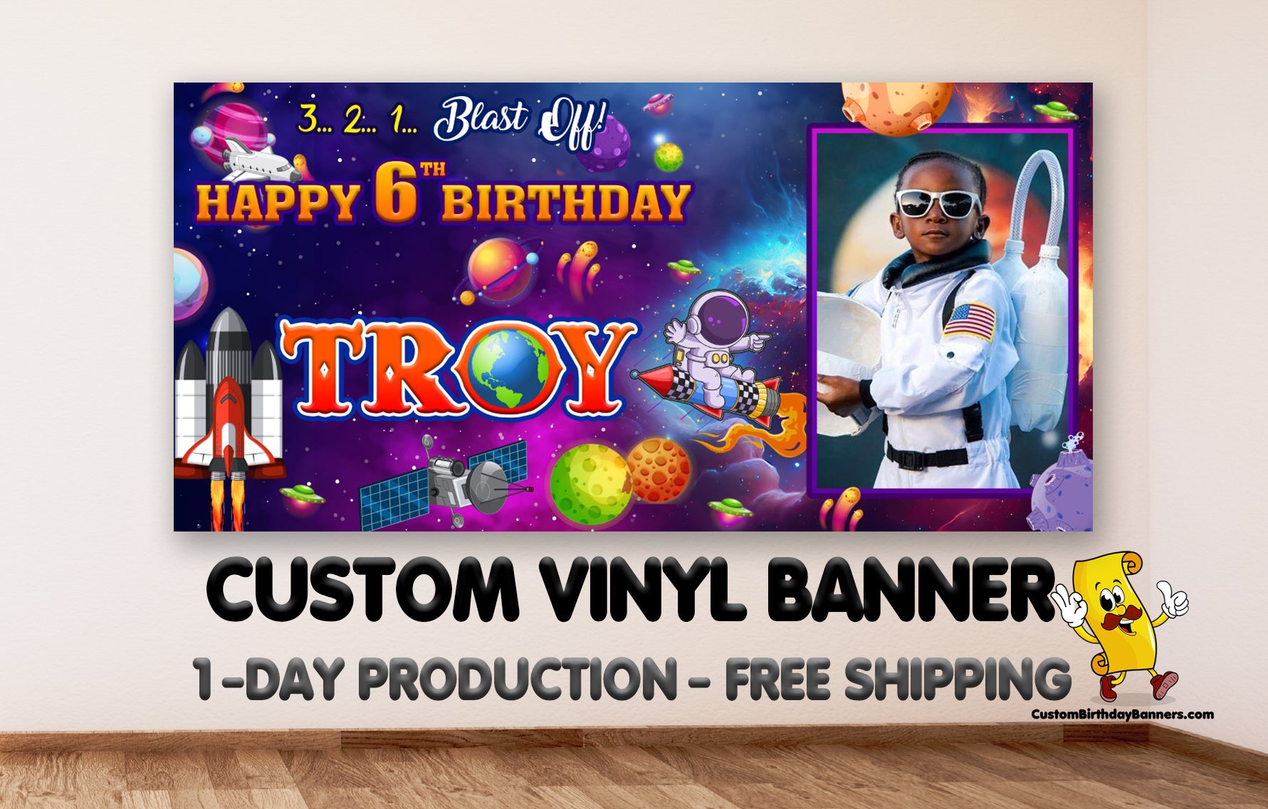 3...2...1...Blast Off! Celebrate your little astronaut with this vibrant full color Astronaut Space personalized birthday banner backdrop! Offered in a variety of sizes, this banner will surely be the centerpiece of your celebration!