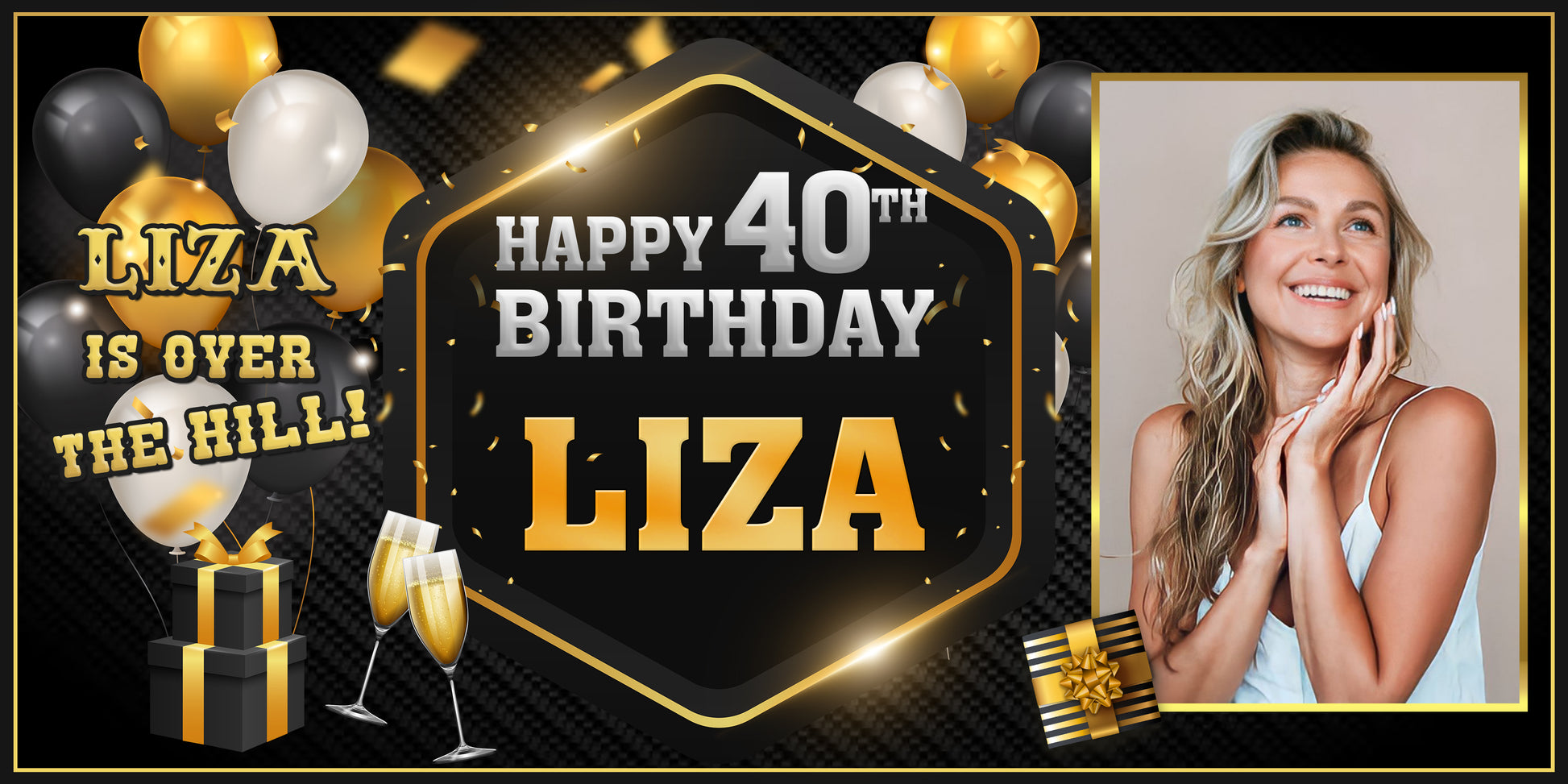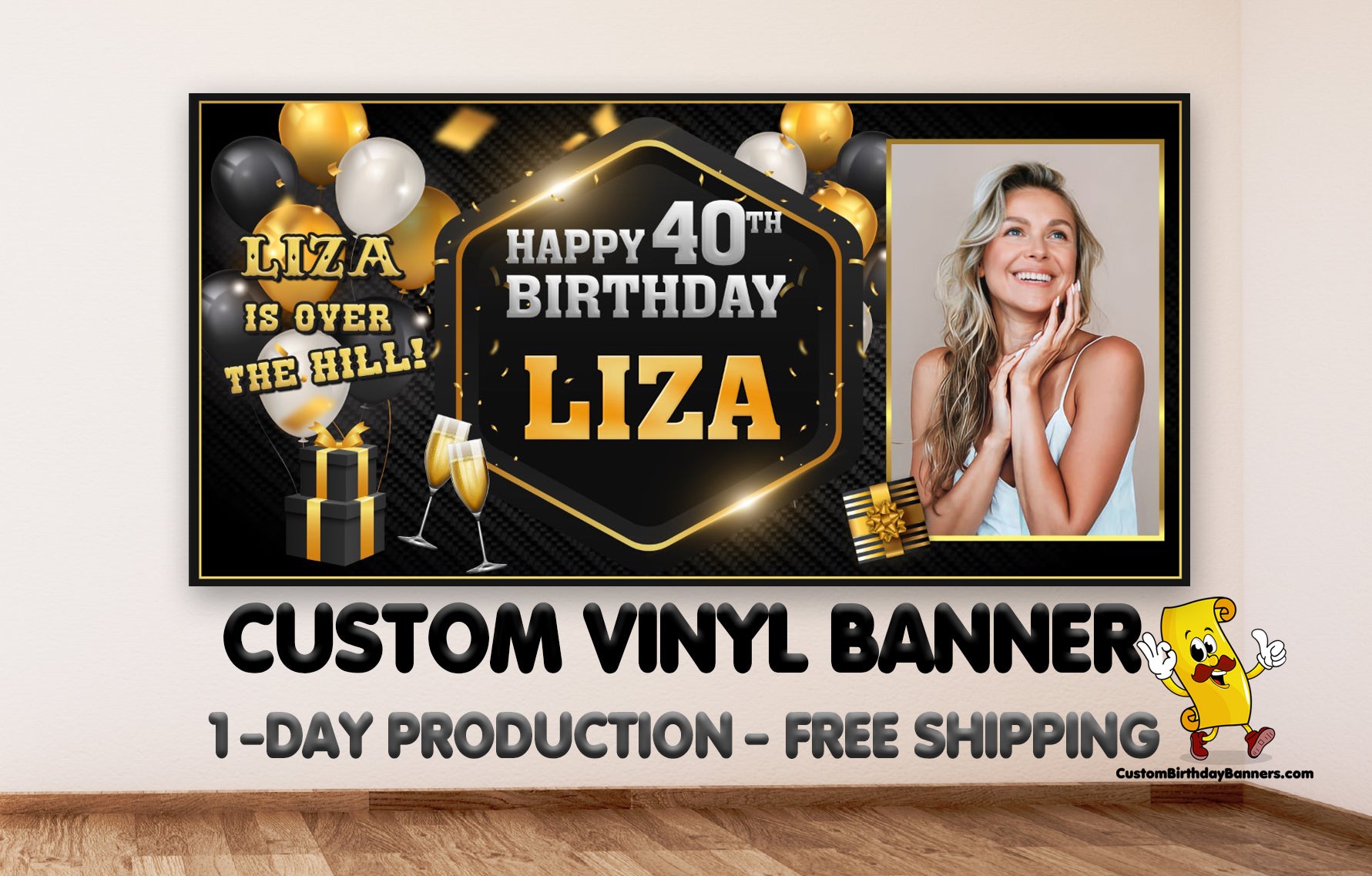 This banner is fully customizable. Select the Customization option and enter the Name and Age (Birthday) being celebrated. You can also edit the birthday message if you'd like something other than "Happy (age) Birthday." Just be sure to enter that information into the customization box.