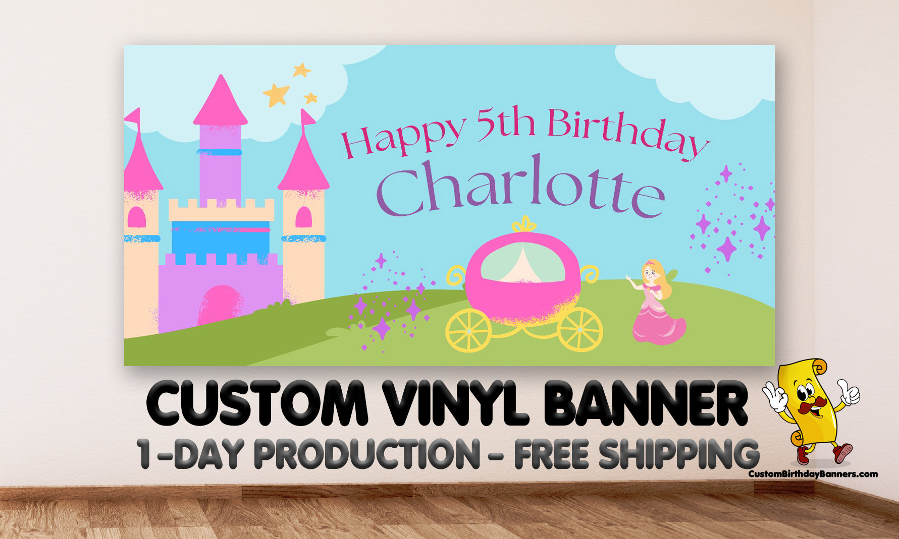 Celebrate your little princess with this vibrant full color Princess Castle Birthday Theme personalized birthday banner backdrop! Offered in a variety of sizes, this banner will surely be the centerpiece of your celebration!
