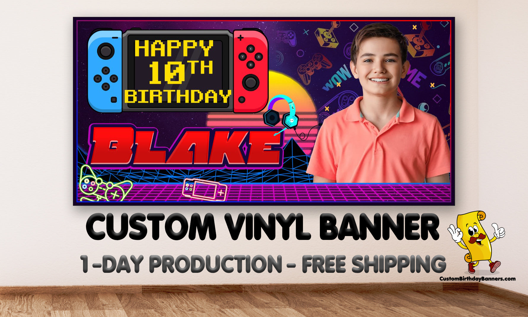 Celebrate your gamer with this vibrant, long-lasting customizable video game birthday celebration banner! The full color nintendo inspired birthday banner features their favorite video game console. Offered in a variety of sizes, this banner will surely be the centerpiece of your construction themed celebration!